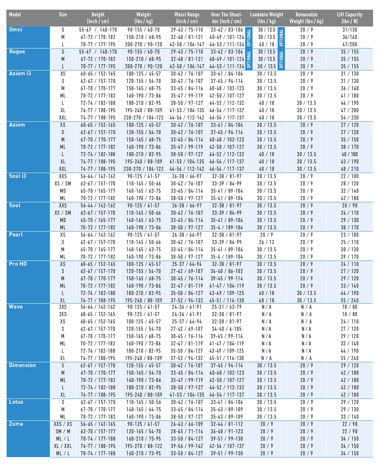 Lift Volume: (lbs/N) XS/S – 29/120, M – 33/140, ML – 33/140