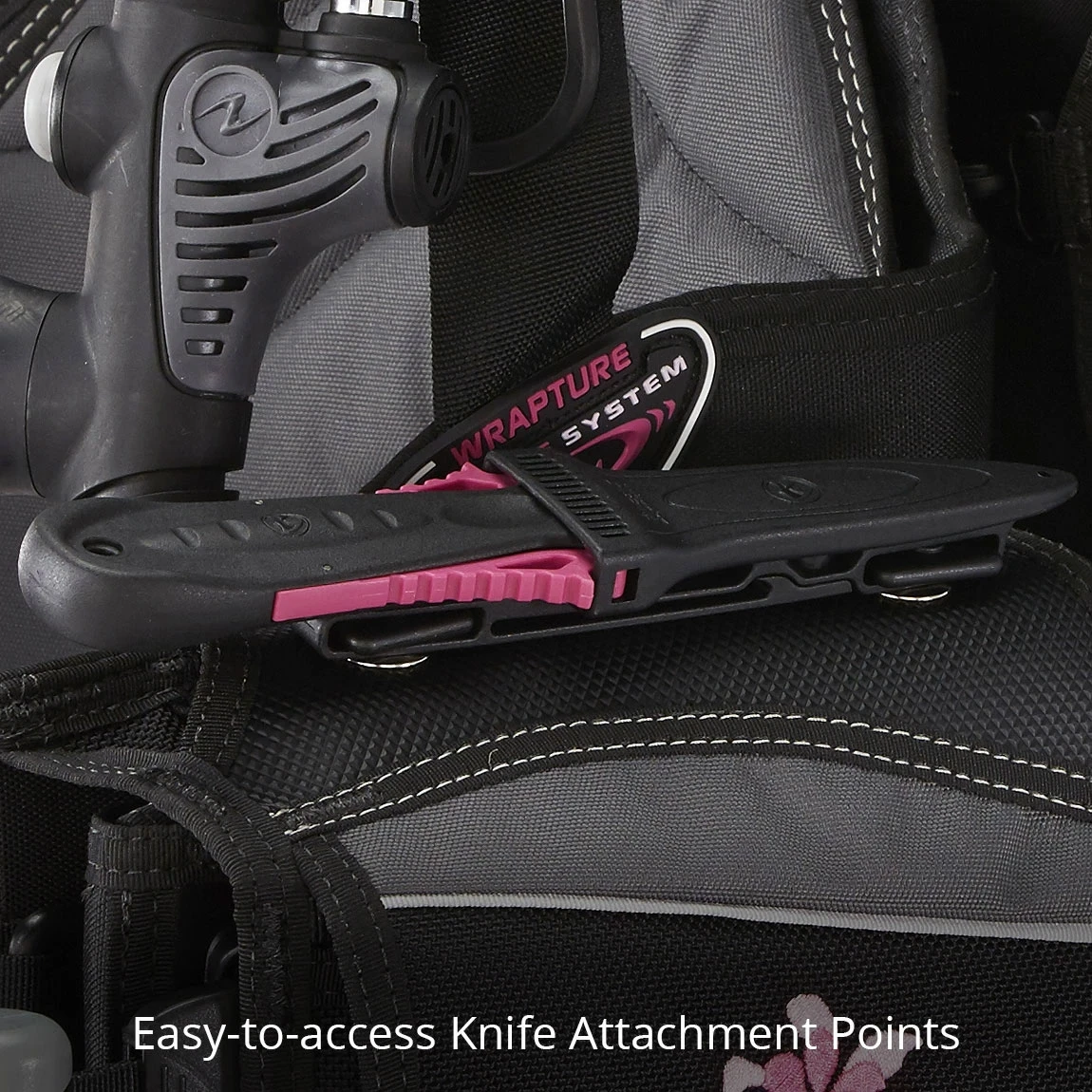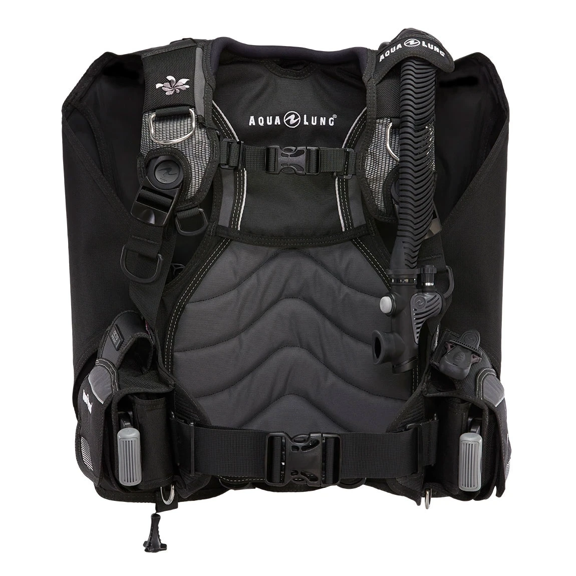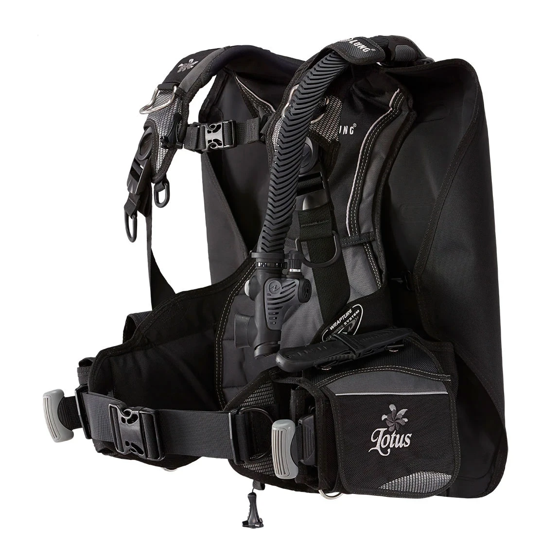 Wrapture™ Harness System: patented swivel shoulder buckles and ultra-thin back plate provide unsurpassed comfort and prevent the BCD from riding up on the surface. Out of the water, the system allows you to stand up straight by keeping the cylinder close to your center of gravity and transferring the weight to your hips