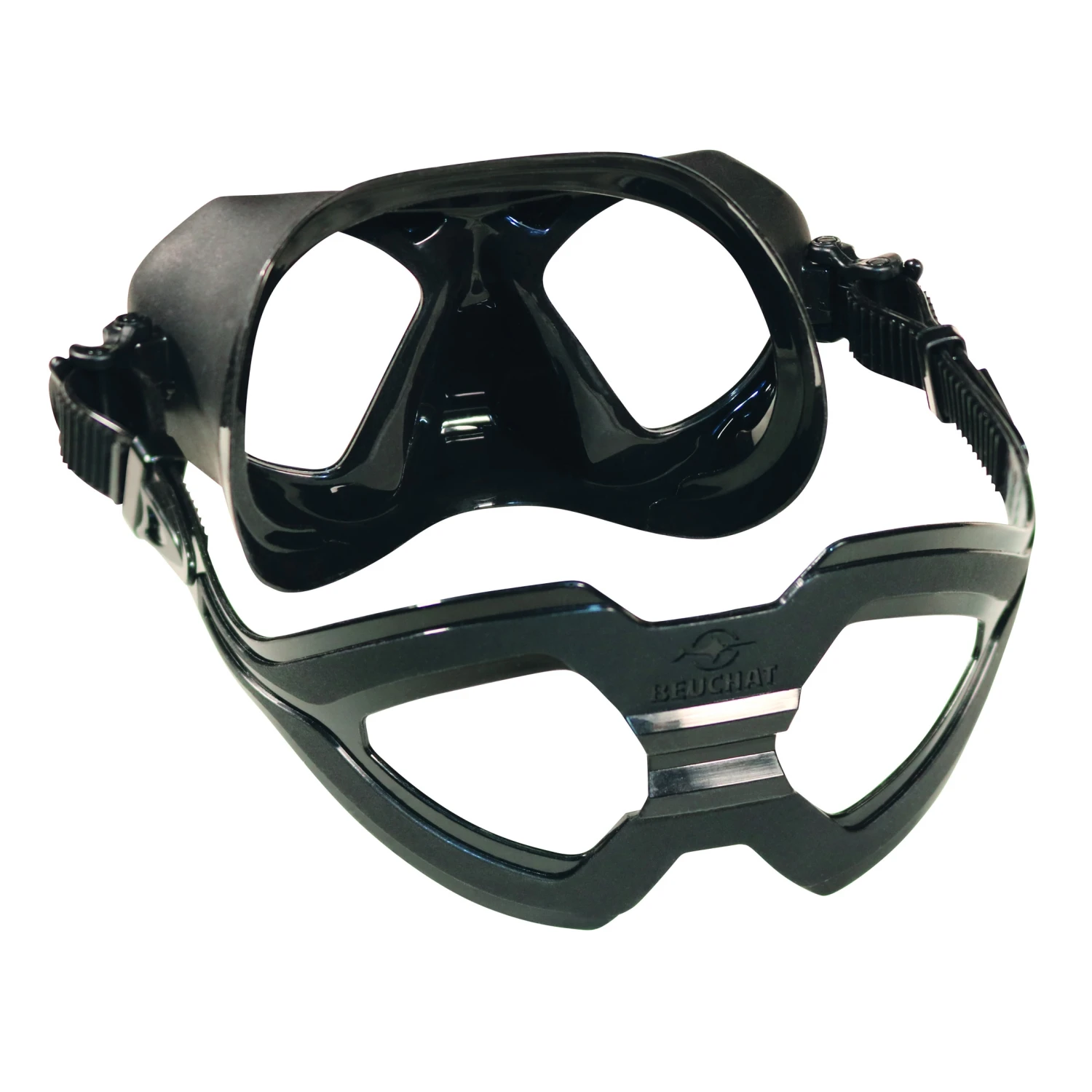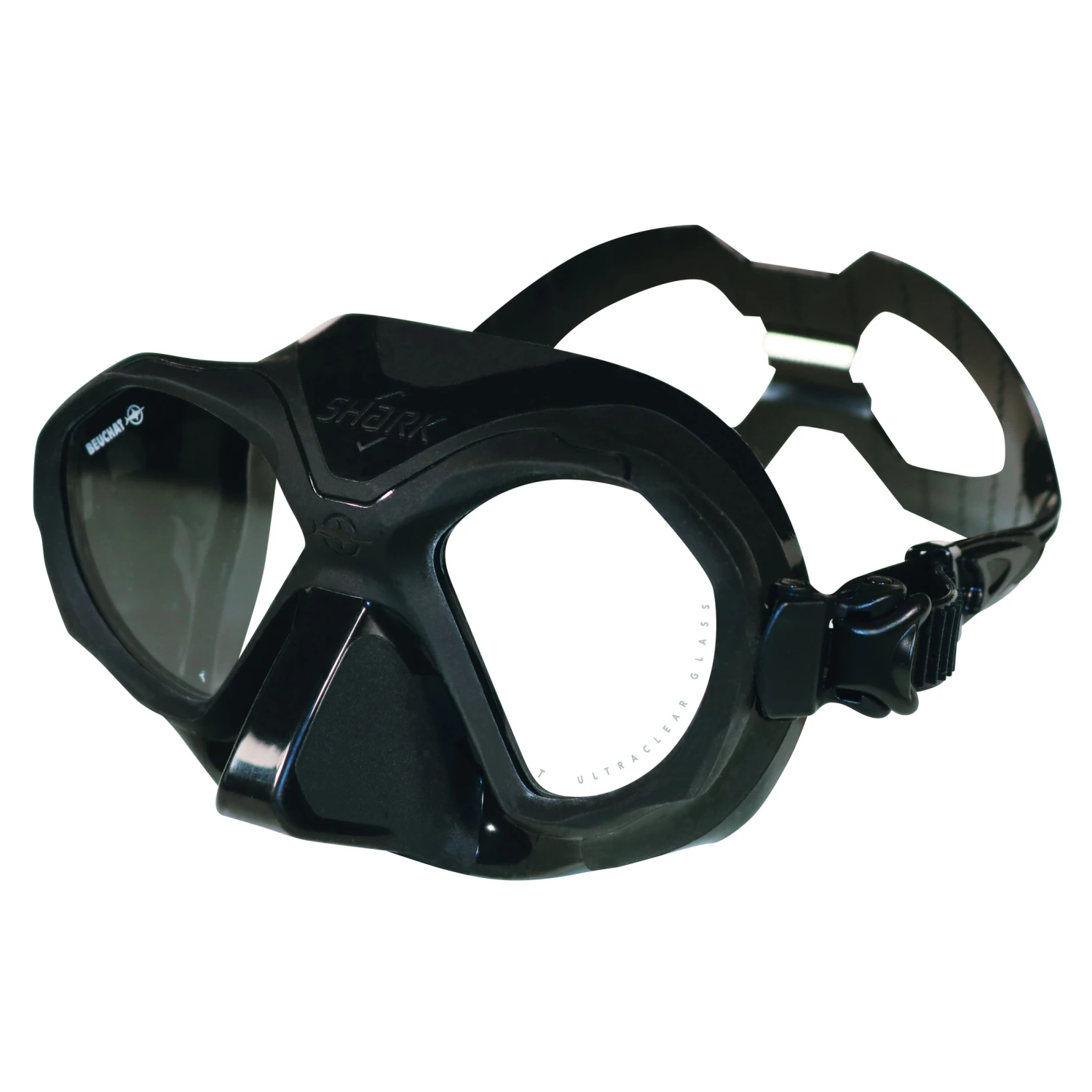 The Shark has been designed to contain a minimum volume of air while offering an extra-large field of vision. It’s the ideal mask for deep and/or repeated free diving sessions. Ultra-clear HD lenses for faithful color rendering and improved contrastImproved comfort for greater pleasure in spearfishing and free divingThe very small internal volume of the Beuchat Shark mask significantly reduces the amount of effort needed to equalize pressure.