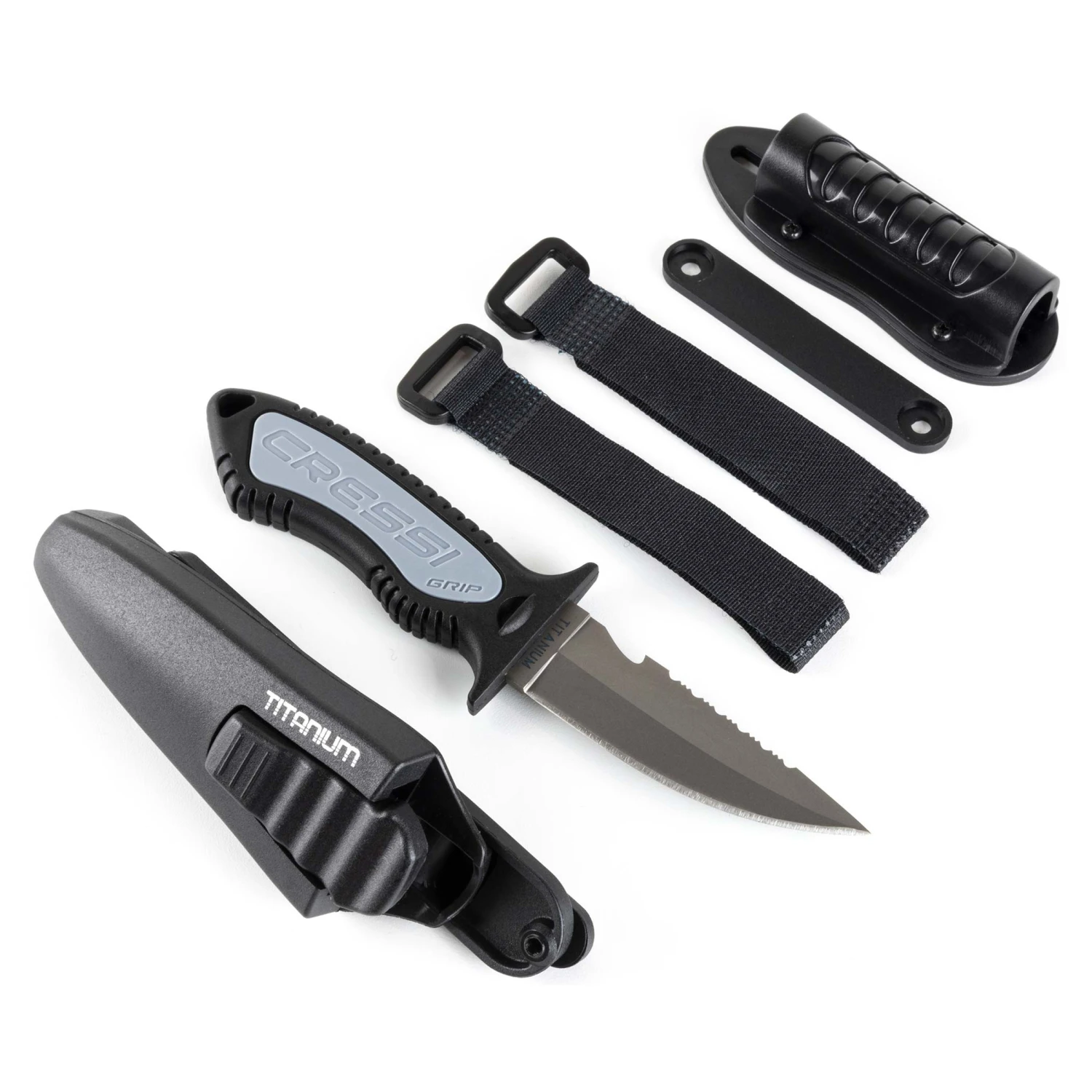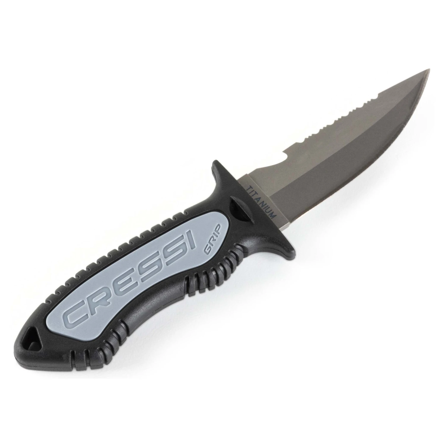 The Grip Titanium is a small-sized knife with a titanium blade that lasts longer and is easy to use. The Titanium Blade is rust resistant and features a high precision sharpened tip. One side is an extra rigid serrated blade for sawing; the other side is a skillfully crafted straight blade. It features an ergonomic non-slip handle grip and a hole to add a lanyard (not included).