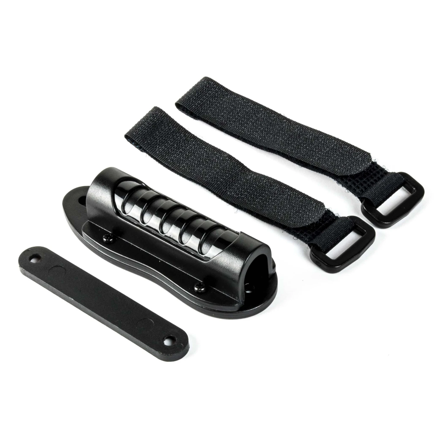 The knife comes with a sheath that can be attached to the BCD shoulder strap or the inflator hose. It has a locking mechanism that prevents the knife from falling out. Two Velcro BC mount straps (long 2 in | 5cm) and a hose mount are included in the package.