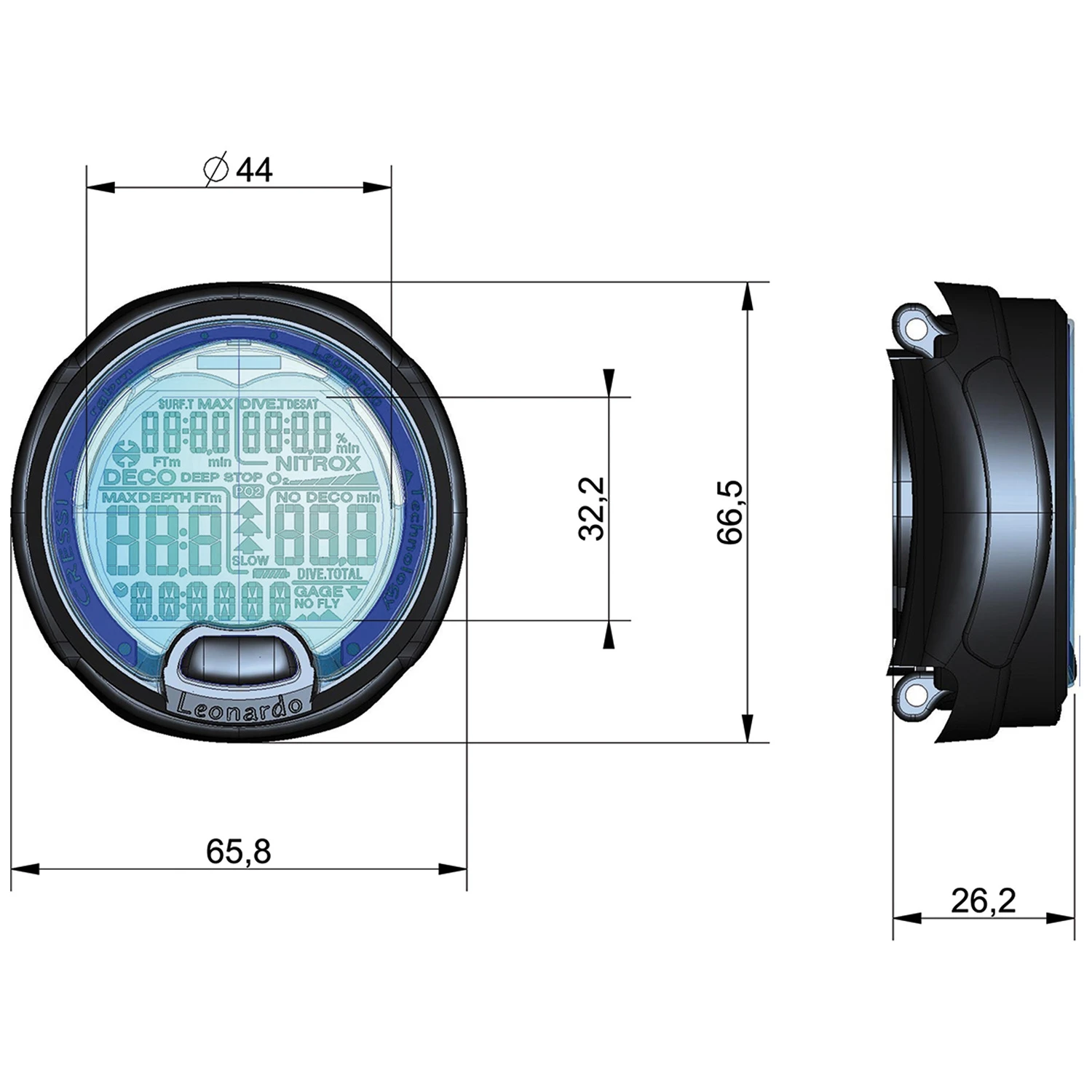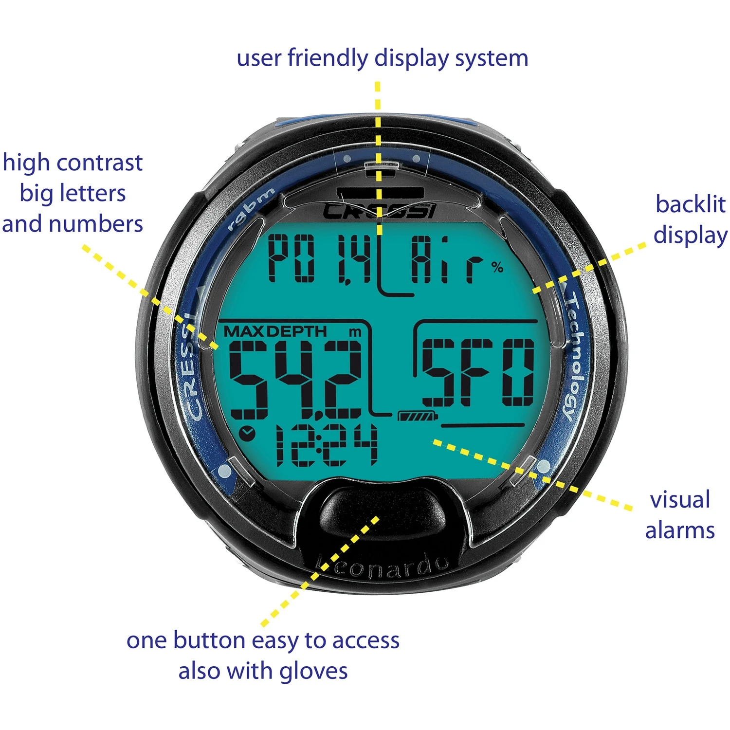 The Leonardo can also be fully re-set after each use, making it an excellent choice for rental departments.-Air, Nitrox and Gauge modes
