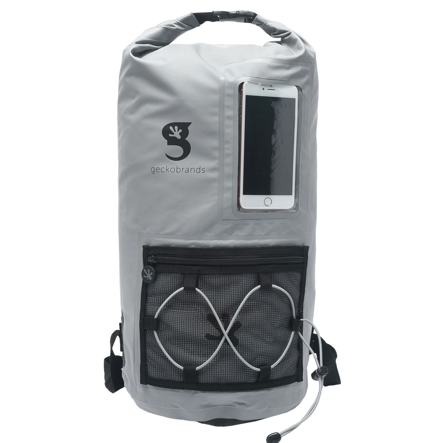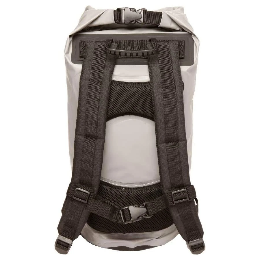 This backpack features a 20L capacity, durable pvc tarpaulin material and a sleeve to store and still use your phone. Have easy access to gear with the outside mesh zip pocket and bungee cords.
