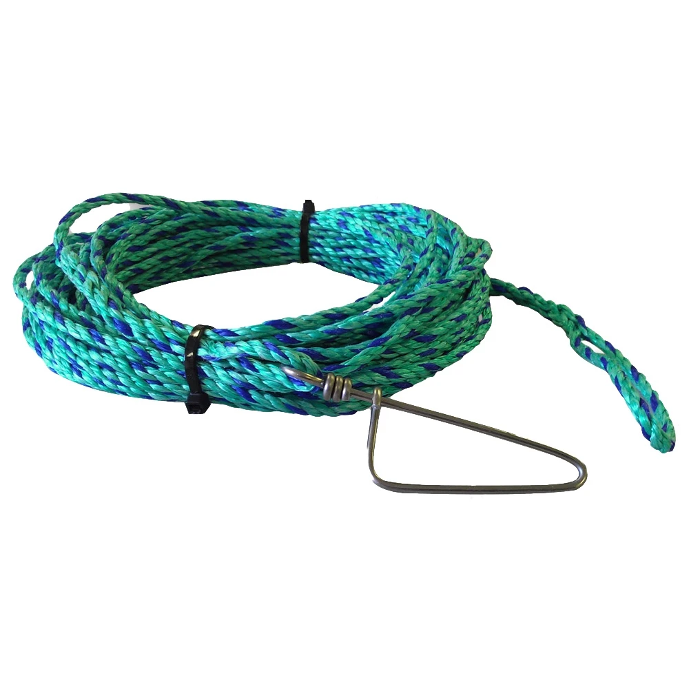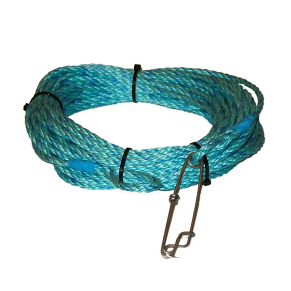 Ice lines are the economical choice for a variety of trail, anchor, or float applications. With the ability to “daisy chain” or make links to reduce the overall length Ice lines make a perfect speargun trail or anchor line. Standard Ice lines are constructed of ~1,200# poly, 3/16″ in diameter, with a 4″ clip on one end and a spliced loop on the other end.