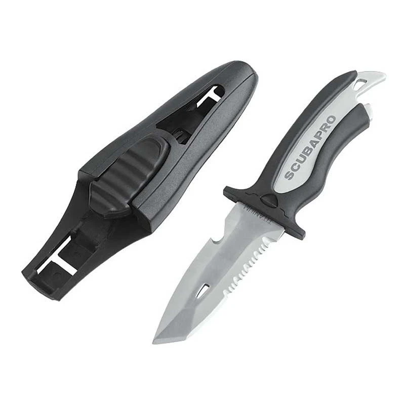 The MAKO TITANIUM’s handle offers plenty of gripping area as well as thumb guards to keep the knife from slipping. Included is a locking sheath with a convenient one-hand release mechanism, plus a kit for mounting onto a BC or a hose.