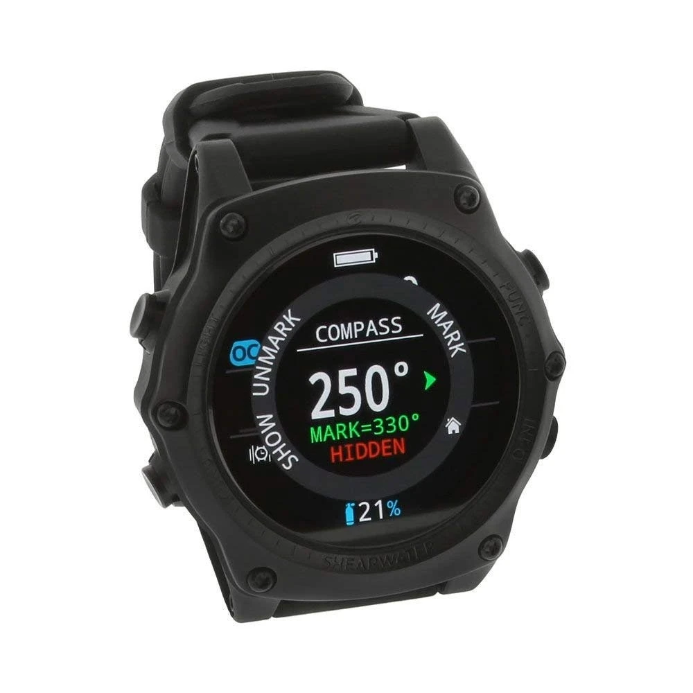 The Teric is also very configurable; for example you can set a button to give you a single press access to different tools like compass, stopwatch, countdown timer, etc. There are haptic (vibration) and audible alarms that can be disabled (none, either, both) to prevent annoying other divers in the vicinity. The Teric offers an information screen utilizing a {1.39 in | 35 mm} full color AMOLED display with a {Diameter x Height | 55mm x 18mm} body and {4.25 oz | 120.4 g} weight.