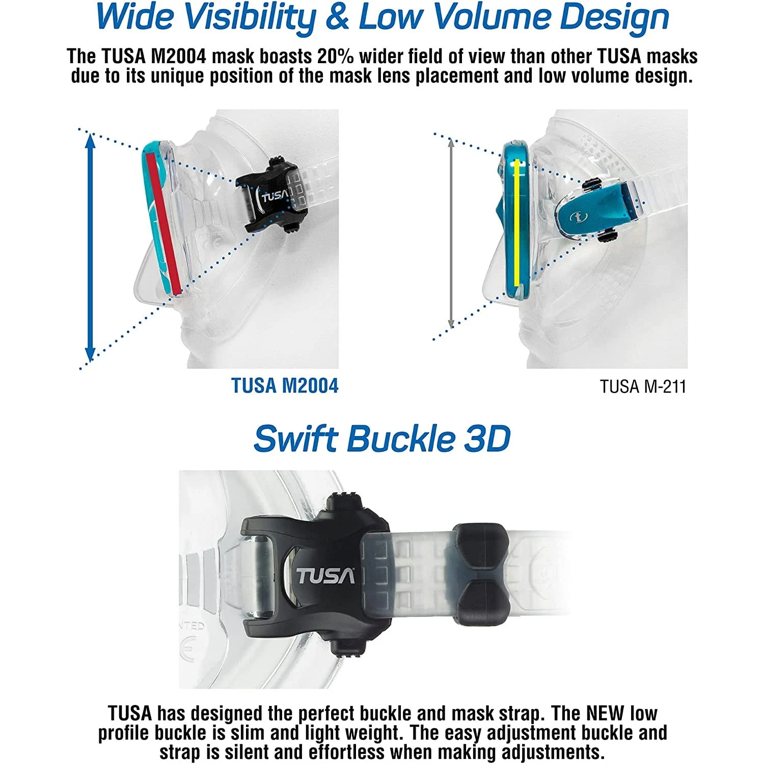 - SWIFT BUCKLE 3D – TUSA has designed the perfect buckle and mask strap. The NEW low profile buckle is slim and light weight. The easy adjustment buckle and strap is silent and effortless when making adjustments.